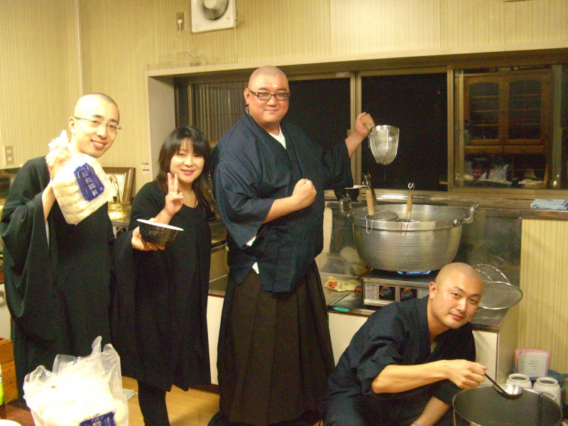 23日の夕方、すべての仏事が終わった後、「祝麺(しゅくめん)」の振る舞いがあった。秋田では全く馴染みがないが、参加者に夕食としてうどんを食べてもらうことである。正傳寺様のうどんは当然のごとく秋田が誇る稲庭うどん。私がいただいたお役は、この祝麺を振る舞う「菜頭(さいじゅう)」である。法要が行われる本堂ではなく、典座寮(てんぞりょう)と呼ばれる調理場が主戦場。私と同じく晋山式に花を添えに来た昭和53年生まれの僧侶仲間たちと共に、100名近い人数分のうどん等を用意する。事前に打ち合わせはしていたが、なにせ初めての役目であるから段取り通りに上手く進まないときも。それでも皆で協力し、なんとか任務完遂。「うどん美味しかったよ」と声を掛けられたときは涙が出そうになった。