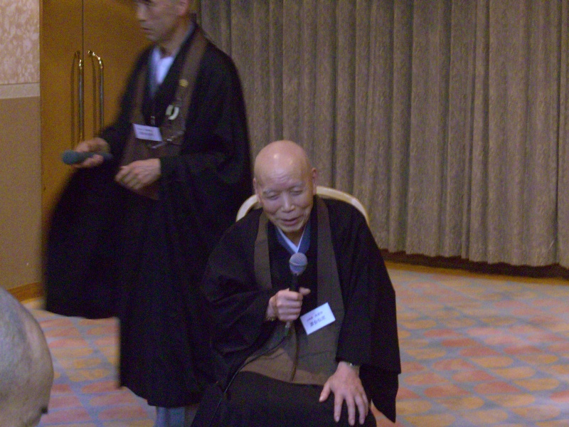 今回まで無償で講師をお務め下さった渡会老師と、同じく愛知県豊川市花井寺井上義臣老師へ会員一同より心ばかりのお礼物の贈呈。渡会老師の謝辞では、ご自身の半生と杉本俊龍老師への参学の回顧をお聞かせくださった。